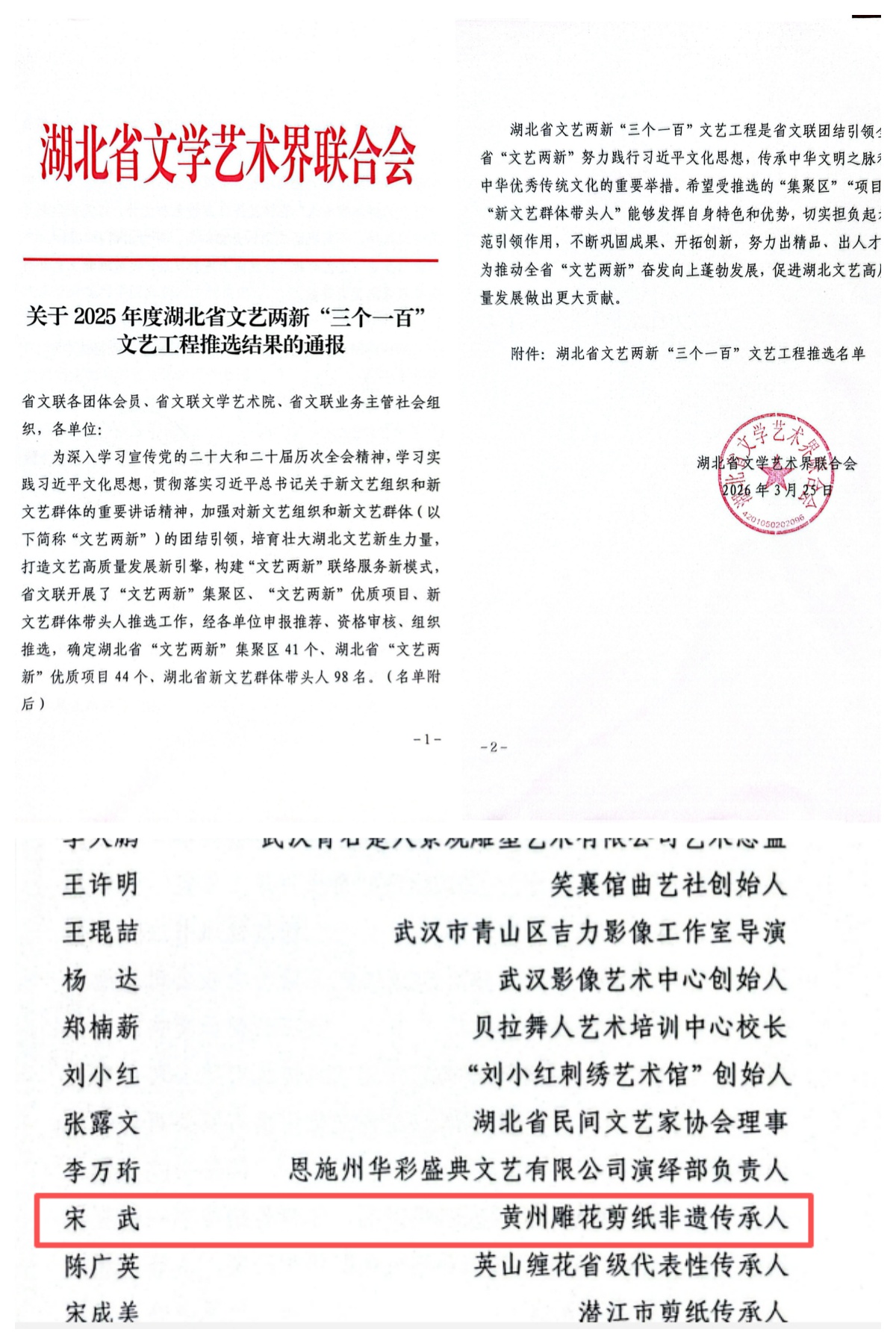 宋武此次入选湖北省文艺两新“三个一百”文艺工程,既是对其专业造诣、坚守传承的充分认可,也是黄州非遗保护工作的重要成果。